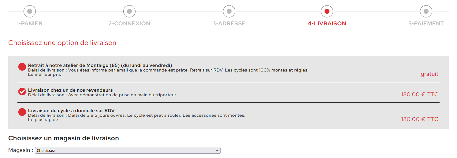 La livraison chez un de nos revendeurs est une autre option intéressante (pour les commandes de triporteurs uniquement, et non les accessoires vendus seuls). Ils s'occuperont en effet de vous faire la mise en selle (réglages) et de vous sensibiliser sur la bonne conduite (!) à tenir avec votre triporteur. L'entretien vous sera aussi expliqué. Cette option vous est proposée à l'étape Livraison de votre panier. Il vous suffit de cocher Livraison chez un de nos revendeurs et de sélectionner celui qui se trouve à proximité de votre domicile. Nous nous chargeons du reste !